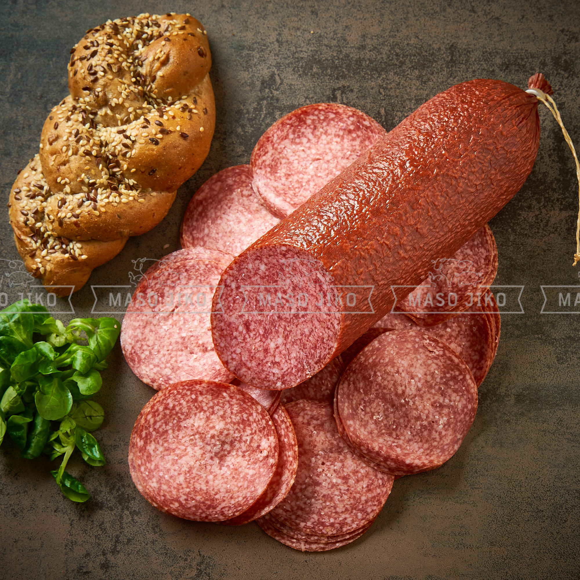 Na 100 g hotového výrobku bylo použito 117 g masa. Složení: vepřové maso, hovězí maso, jedlá sů, konzervant E250, kkořenící přípravek (koření, barvivo E120, E162, maltodextrin, antioxidant E316, kouřové aroma, droždí, dextróza), startovací kultura mikroorganismů, česnek. Bez lepku. Výživové údaje na 100g: energie 1903kJ/460kcal, tuky 41,8g, z toho nasycené mastné kyseliny, 15,3g, sacharidy 2,7g, z toho cukry 1,1g, bílkoviny 18,4g, sůl 3,7g.