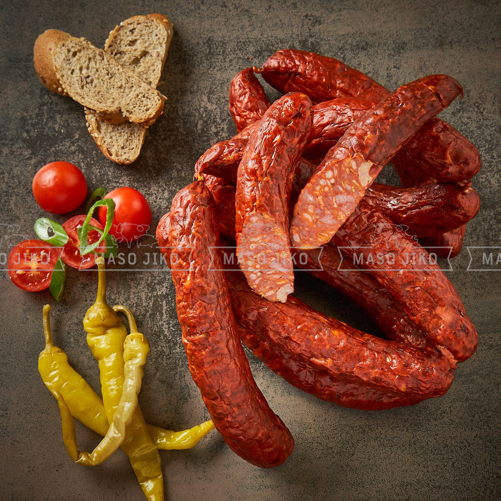 Vepřové maso a hovězí maso min 96 %,vepřové sádlo, pitná voda, sůl, konzervant: dusitan sodný,cukr, přírodní koření, extrakty koření, kouřové aroma, kouř,.barvivo E120, látka zvýrazňující chuť a vůni E621, antioxidant E316,stabilizátory E450,E451, dextróza(monohydrát), emulgátor E471,antioxidant E300,R301,E316. Výživové údaje na 100g:energetická hodnota:1408kJ/336 kcal,tuky:30g, z toho nasycené mastné kyseliny:11g,sacharidy:0,7g, z toho cukry:0,4g, bílkoviny:17g,sůl:2,2g Skladujte při teplotě od 0°C do +7°C