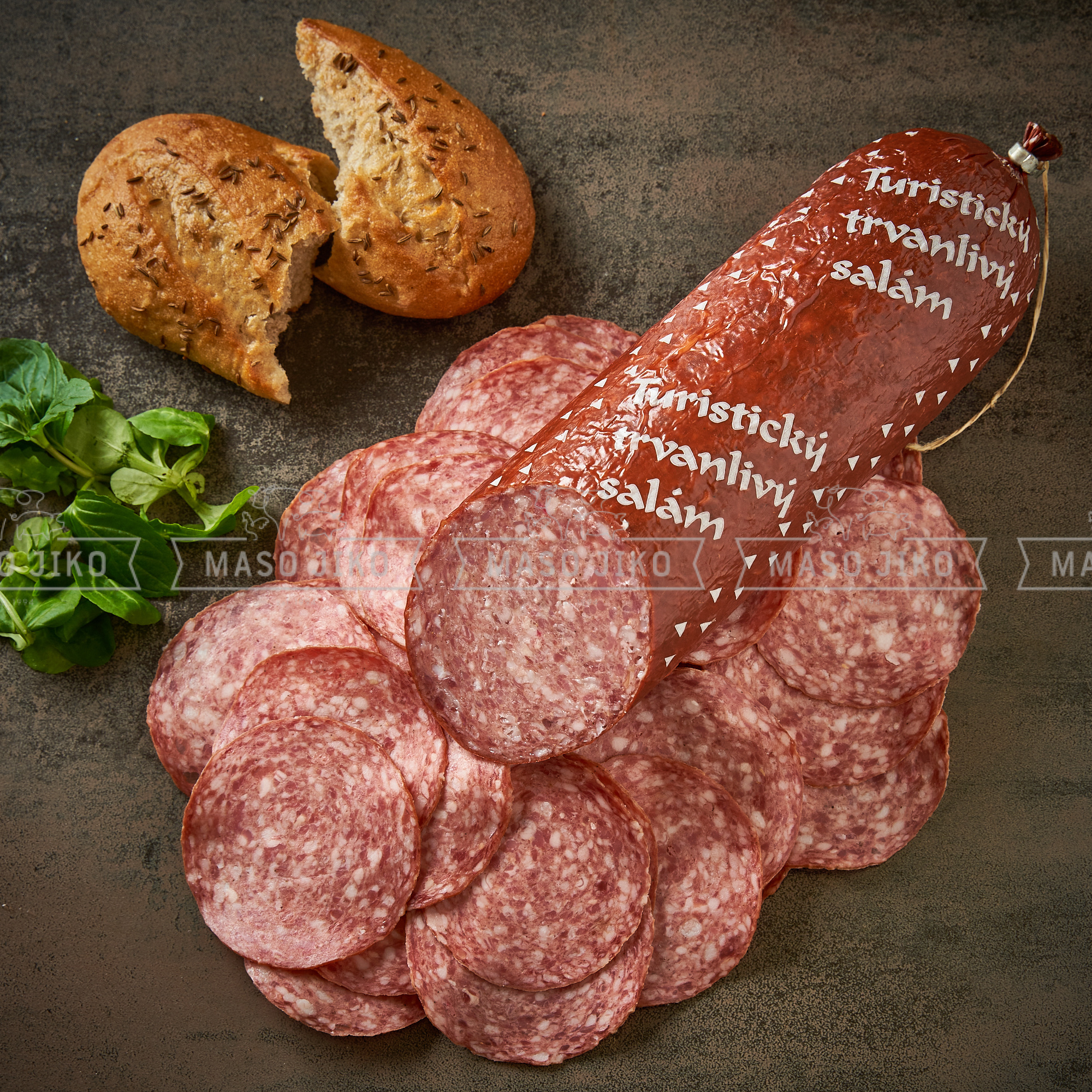 Vepřové maso,hovězí maso,vepřové sádlo,upravené vepřové kůže(vepřové kůže, škrob,stabilizátor E450,regulátor kyselosti E338), jedlá sůl,konzervant E250, regulátor kyselosti E338) , jedlá sůl, konzervant E250, škrob, kořenící přípravek (koření, látky zvýrazňující chuť a vůni E621, E627, antioxidant E315, E330, cukr zahušťovadlo E417, barvivo E120, E150c, E150 d), česnek, bez lepku. Výživové hodnoty na 100g: energie 1621kJ/392kcal, tuky 34,8g, z toho nasycené mastné kyseliny 11,5g, sacharidy 2,2g, z toho cukry 0,7g, bílkoviny 17,4g, sůl 3g. Na 100g výrobku bylo použito 115g masa. Obsah čistých svalových bílkovin: 14%. Obsah soli:max. 3,5%, obsah tuku: max 40%.