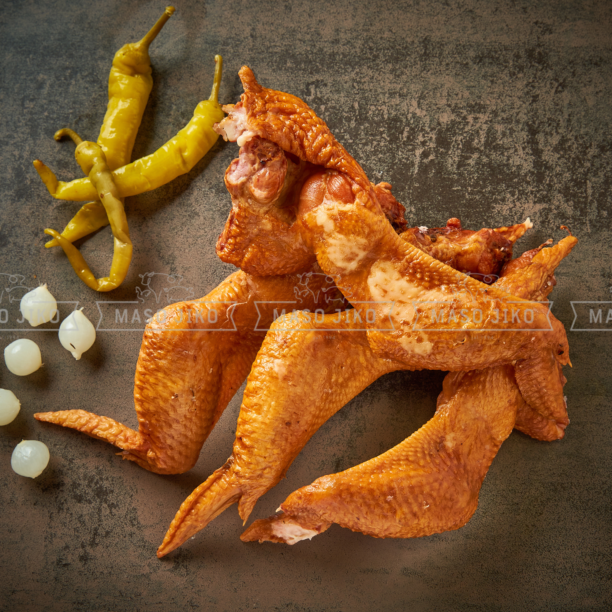 Kuřecí křídla 95%,sůl,konzervant E250,jodičnan draselný,voda,stabilizátory E450,E451,sacharoza,,dextroza,dochucovadla,hydrolyzované rostlinné bílkoviny,antioxidant E316,emulgátor E471. Výživové hodnoty na 100g: energie 781kJ/187kcal, tuky 14g, z toho nasycené mastné kyseliny 3,9g, sacharidy 0,6g, z toho cukry 0,2g, bílkoviny 16g, sůl 0,82g. Obsah tuku max. 30%. Obsah soli max. 3,5%. Po otevření spotřebujte do 72 hodin