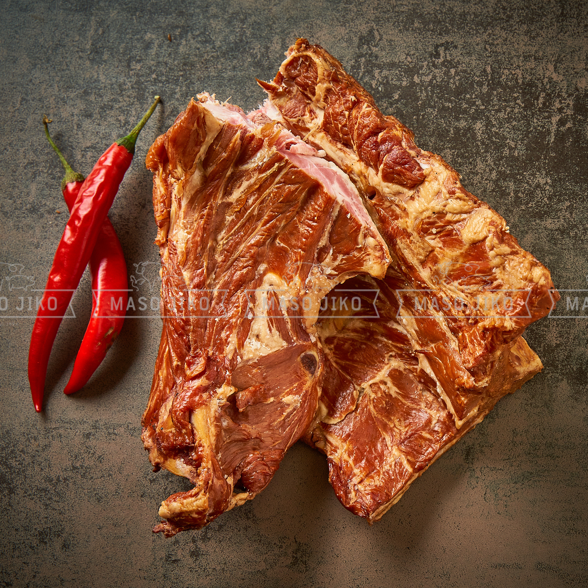 Vepřová žebra,voda,jedlá sůl s jodem, konzervant E250,Jodičnan draselný. Výžiovoé hodnoty na 100g: energie 889kJ/214kcal, tuky 14g, z toho nasycené mastné kyseliny 5,2g, sacharidy 0g, z toho cukry 0g, bílkoviny 21g, sůl 5,5g. Obsah soli max. 3,5%.Po otevření spotřebujte do 48 hodin.
