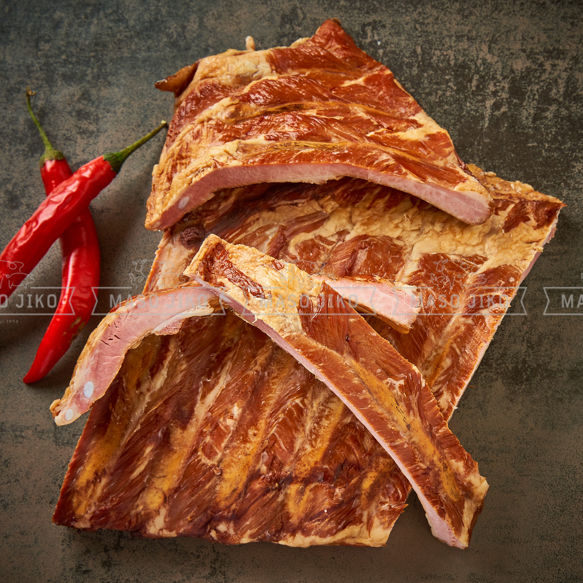 Vepřová žebra, voda, jedlá sůl s jodem, konzervant E250, Jodičnan draselný. Výžiovové hodnoty na 100g: energie 889kJ/214kcal, tuky 14g, z toho nasycené mastné kyseliny 5,2g, sacharidy 0g, z toho cukry 0g, bílkoviny 21g, sůl 5,5g. Obsah soli max. 3,5%. Po otevření spotřebujte do 48 hodin.