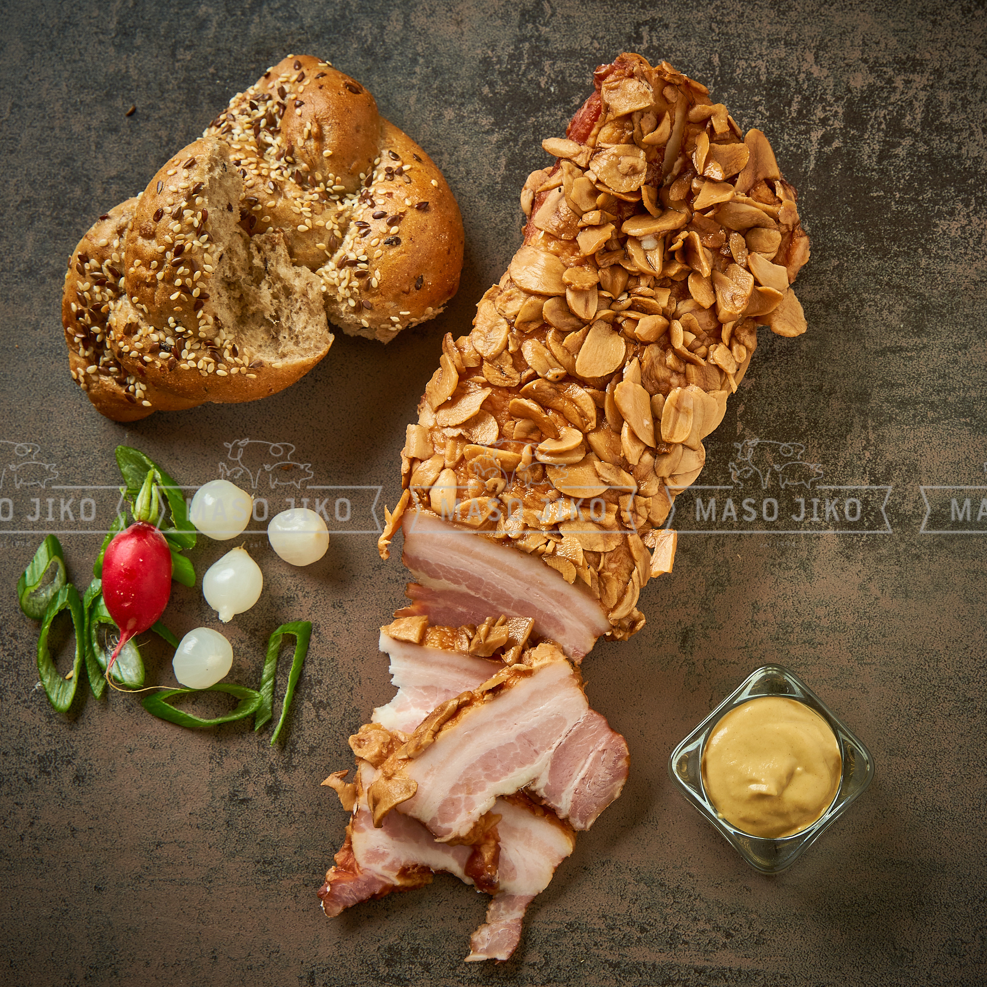 Vepřový bok bez kosti 88%, sůl, konzervant E250, jodičnan draselný,stabilizátor E450,E451,zahuštovadlo E407, dextroza, antioxidant E316,modifikovaný kukuřičný škrob E1420,regulátorkyselosti E331,extrakty koření, česnekové floky,barvivo E120,Přírodní aroma, Výživové hodnoty na 100g: energie 1247kJ/300kcal, tuky 27g, z toho nasycené mastné kyseliny 7g, sacharidy 1,6g, z toho cukry 0,2g, bílkoviny 13g, sůl 1,9g. Po otevření spotřebujte do 24 hodin.