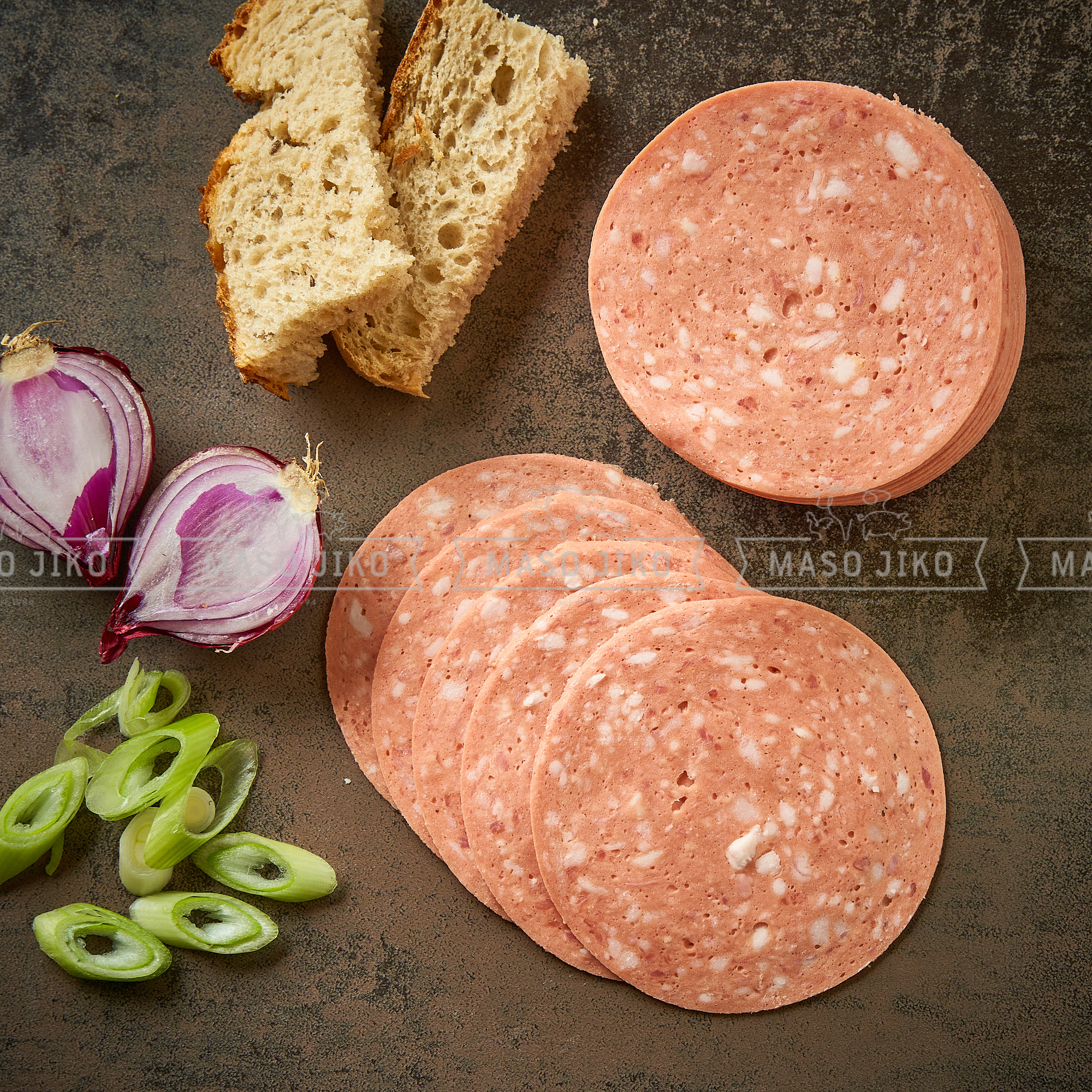 Vepřové sádlo 30% vepřové 25%a hovězí 17% maso,konzervantE250,stabilizátor.E451,látky zvýrazňující.chuť E621, E635, voda, sušená zelenina (česnek),glukozový sirup,bramborový škrob,sůlextrakty koření,antioxidant E316,barvivo karmina,emulgátor E433. Jodičnan draselný. Výživové hodnoty na 100g: energie 1080kJ/260kcal, tuky 22g, z toho nasycené mastné kyseliny 9,1g, sacharidy 0,4g, z toho cukry 0,2g, bílkoviny 15g, sůl 2g. Obsah tuku:max.40%. Obsah soli: max.2,5%.C. Po otevření spotřebujte do 24 hodin
