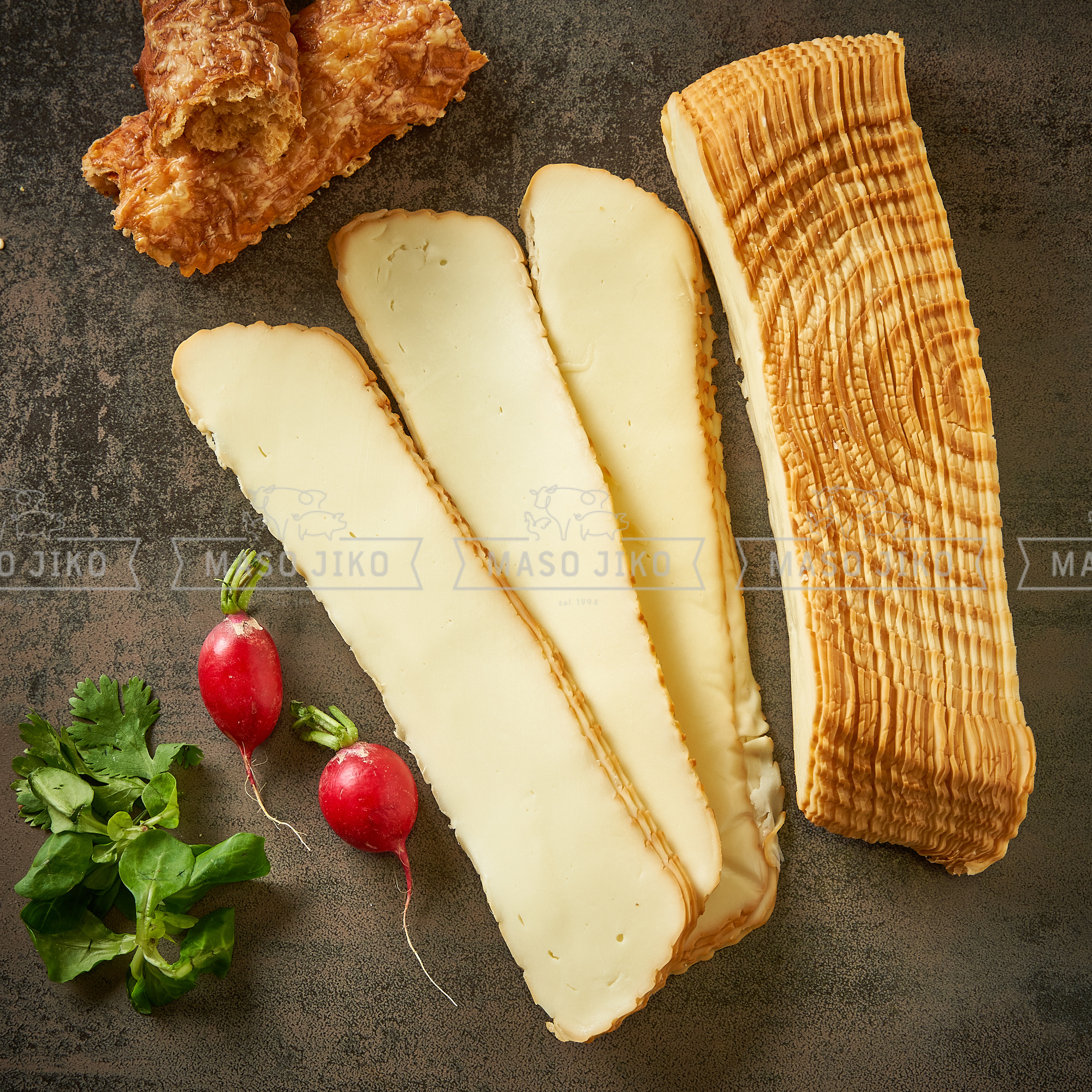 pasterizované MLÉKO, jedlá sůl, stabilizátor E509, čisté bakteriální kultury, syřidlo,. Výživové údaje na 100g: energetická hodnota 1328kJ/320kcal, tuky 24g, z toho nasycené mastné kyseliny 15g, sacharidy 0,9g, z toho cukry 0,9g, bílkoviny 25g, sůl 14g. Obsah tuku min: 40%, obsah sušiny min 48%. Po otevření spotřebujte do 24 hodin.