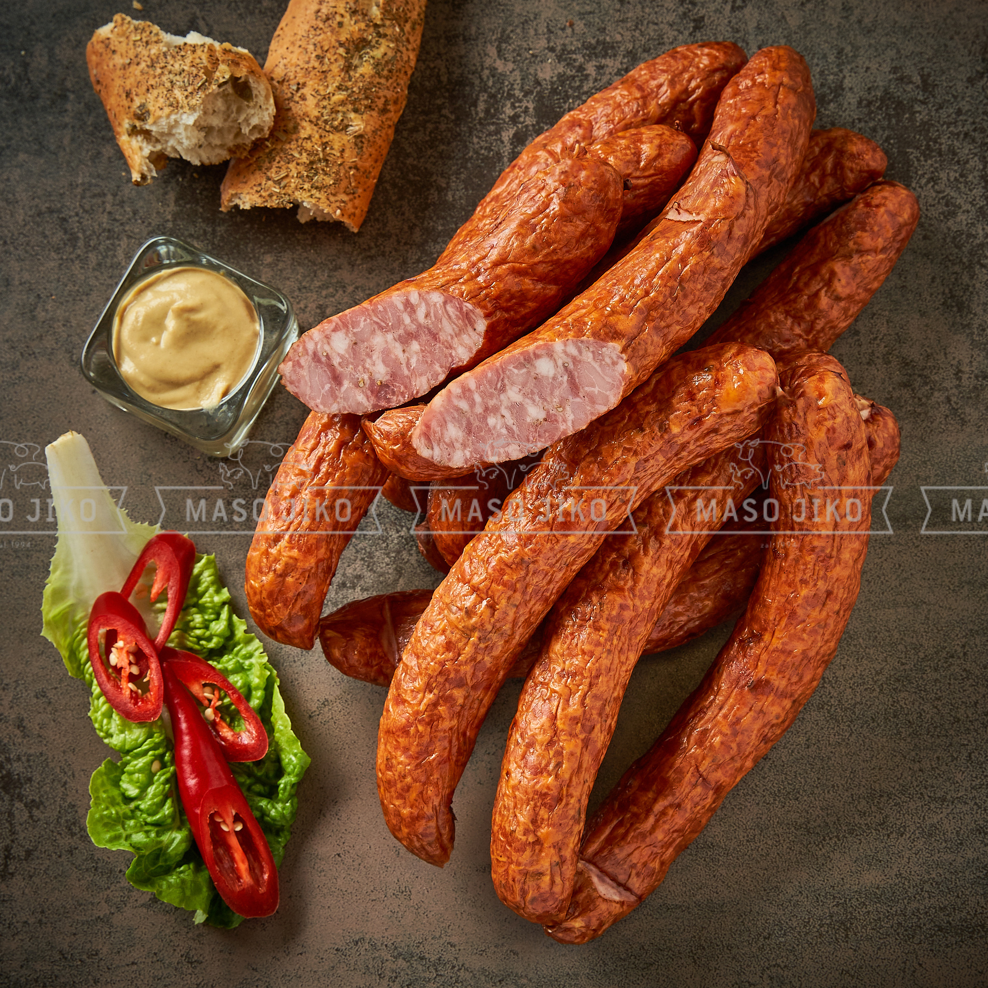 Vepřové maso a hovězí maso min 96 %,vepřové sádlo, pitná voda,sůl,konzervant: dusitan sodný, stabilizátor:di+trifosforečnan sodný, askorban sodný, cukr, přírodní koření, extrakty koření, kouřové aroma, kouř, zvýrazňovač chuti: glutamát sodný.Výživové hodnoty na 100g: Energie 1422kJ/340kcal, tuky 30g, z toho nasycené mastné kyseliny 12g, sacharidy 0,6g, z toho cukry 0,4g, bílkoviny 18g, sůl 2,4g.
