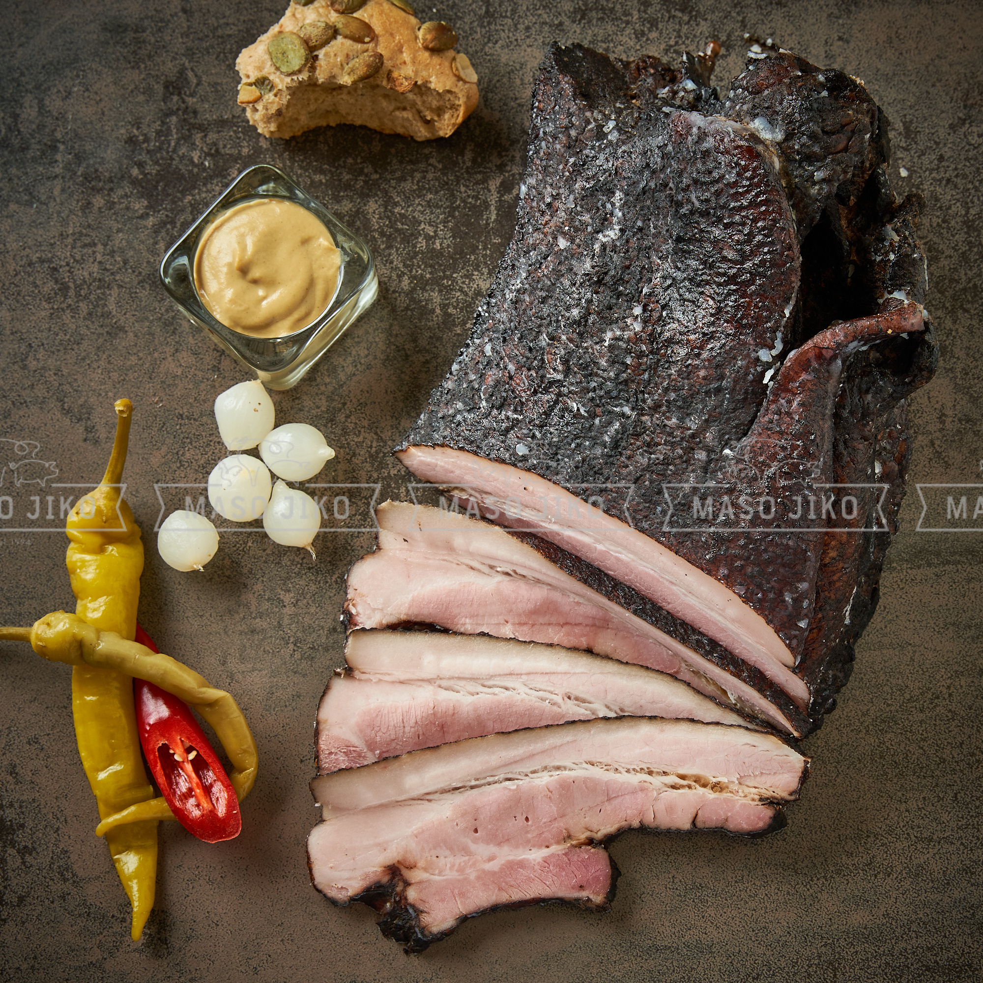 Vepřový bok,sůl,konzervant:dusitan sodný,stabilizátor E451,E450, antioxidant E301,cukr,extrakty koření,kouřové aroma,kouř,zvýrazňovač chuti a vůně E621, zahušťovadlo E407a, maltodextrin, kuler.Na 100g výrobku bylo použito 105 g vepřového boku.Výživové hodnoty na 100g: energie 1369kJ/327kcal, tuky 30g, z toho nasycené mastné kyseliny 7,7g, sacharidy 1,1g, z toho cukry 1g, bílkoviny 15g, sůl 3,2g. Po otevření spotřebujte do 48 hodin.