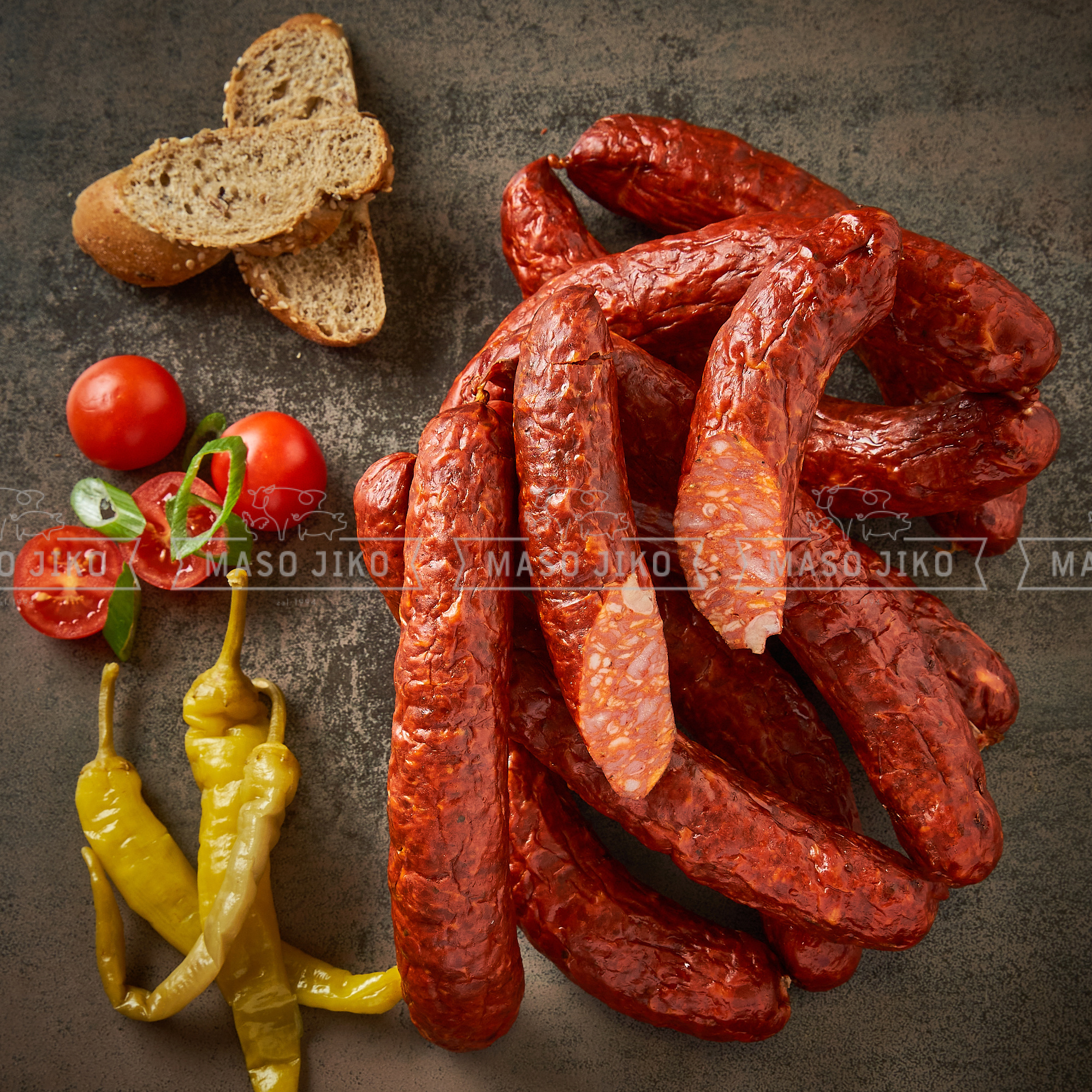 Vepřové maso a hovězí maso min 96 %,vepřové sádlo, pitná voda, sůl, konzervant: dusitan sodný,cukr, přírodní koření, extrakty koření, kouřové aroma, kouř,.barvivo E120, látka zvýrazňující chuť a vůni E621, antioxidant E316,stabilizátory E450,E451, dextróza(monohydrát), emulgátor E471,antioxidant E300,R301,E316. Výživové údaje na 100g:energetická hodnota:1408kJ/336 kcal,tuky:30g, z toho nasycené mastné kyseliny:11g,sacharidy:0,7g, z toho cukry:0,4g, bílkoviny:17g,sůl:2,2g Skladujte při teplotě od 0°C do +7°C