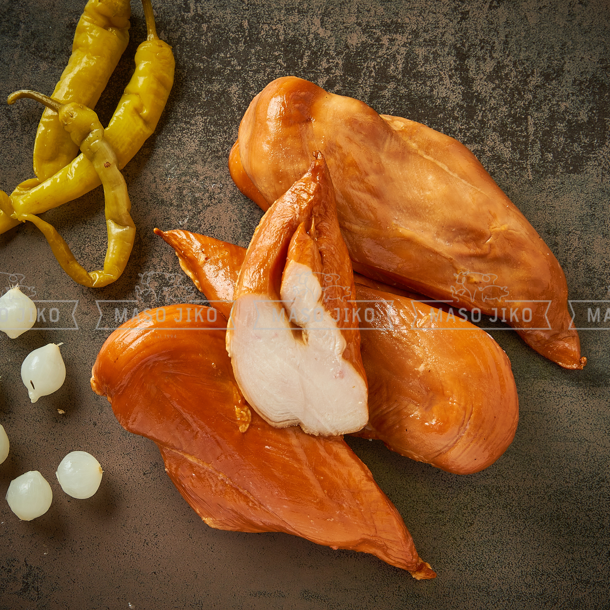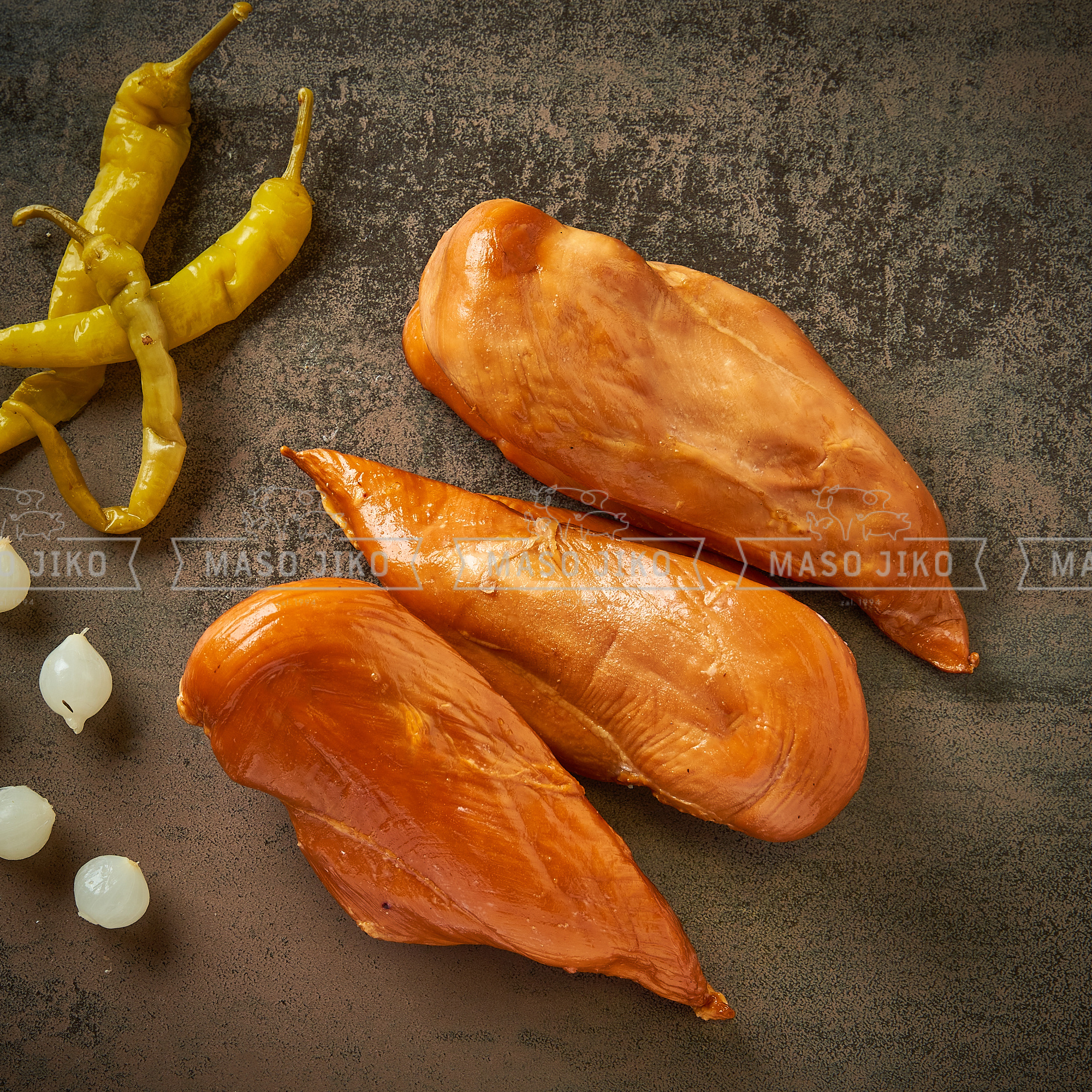 Kuřecí prsa 88%,sůl,konzervant E250, jodičnan draselný,voda,stabilizátory E450, E451, sacharoza,,dextroza,dochucovadla,hydrolyzované rostlinné bílkoviny,antioxidant E316,emulgátor E471. Výživové hodnoty na 100g: energie 354kJ/84kcal, tuky 0,9g, z toho nasycené mastné kyseliny 0,3g, sacharidy 1,3g, z toho cukry 0,4g, bílkoviny 18g, sůl 1,4g. Po otevření spotřebujte do 72 hodin